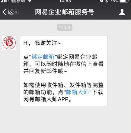 流程很简单!您只需关注“网易企业邮箱服务号”并绑定企业邮箱帐号,即可在微信中享受收信提醒、预览邮件及其附件、快速回复/转发邮件、快捷写信的服务。